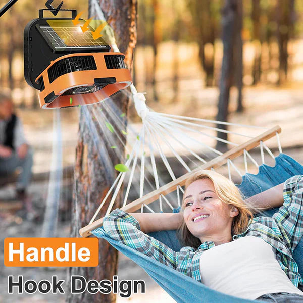 TheGlimjoy solar camping fan combines a cooling fan, bright LED light, and a reliable power bank. For the first time, photovoltaic conversion is applied to fans, with a 300% increase in battery life. It is foldable and lightweight, making it your preferred outdoor companion.